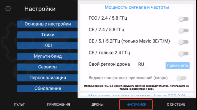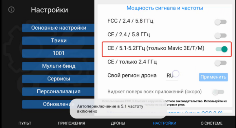 Далее активируем бегунок напротив СЕ / 5.1-5.2ГГц (только для Mavic 3E/T/M)