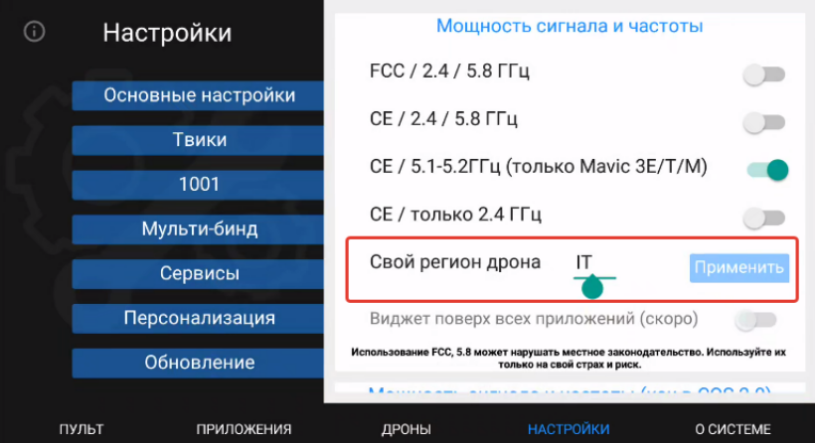 Вводим регион дрона — «IT» и нажимаем кнопку «Применить»