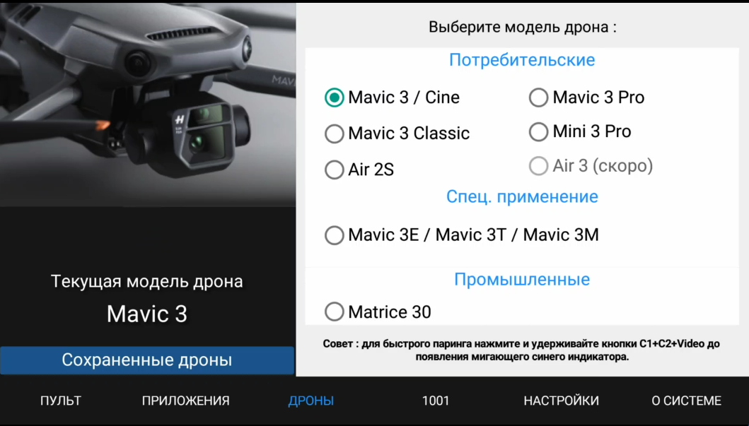 Выбираем нужную модель. Далее пульт сам перенастроит внутренние компоненты под выбранную модель дрона.Процесс переключения может занимать до 10 минут.