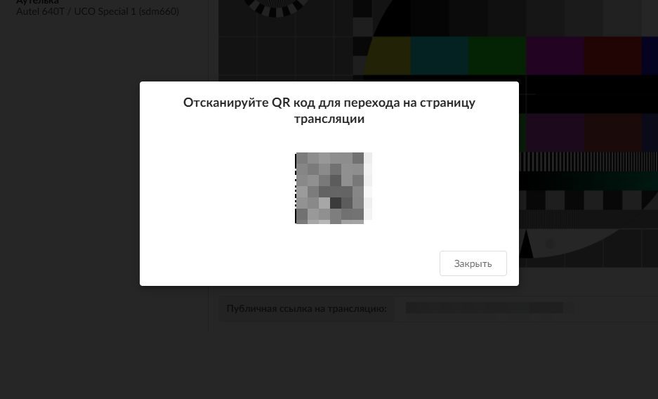Под окном трансляции размещена публичная ссылка, с помощью которой можно поделиться трансляцией. Рядом расположены кнопки для копирования ссылки, открытия QR-кода, получения кода для трансляции в Solar Connect, а также кнопка для включения парольной защиты.